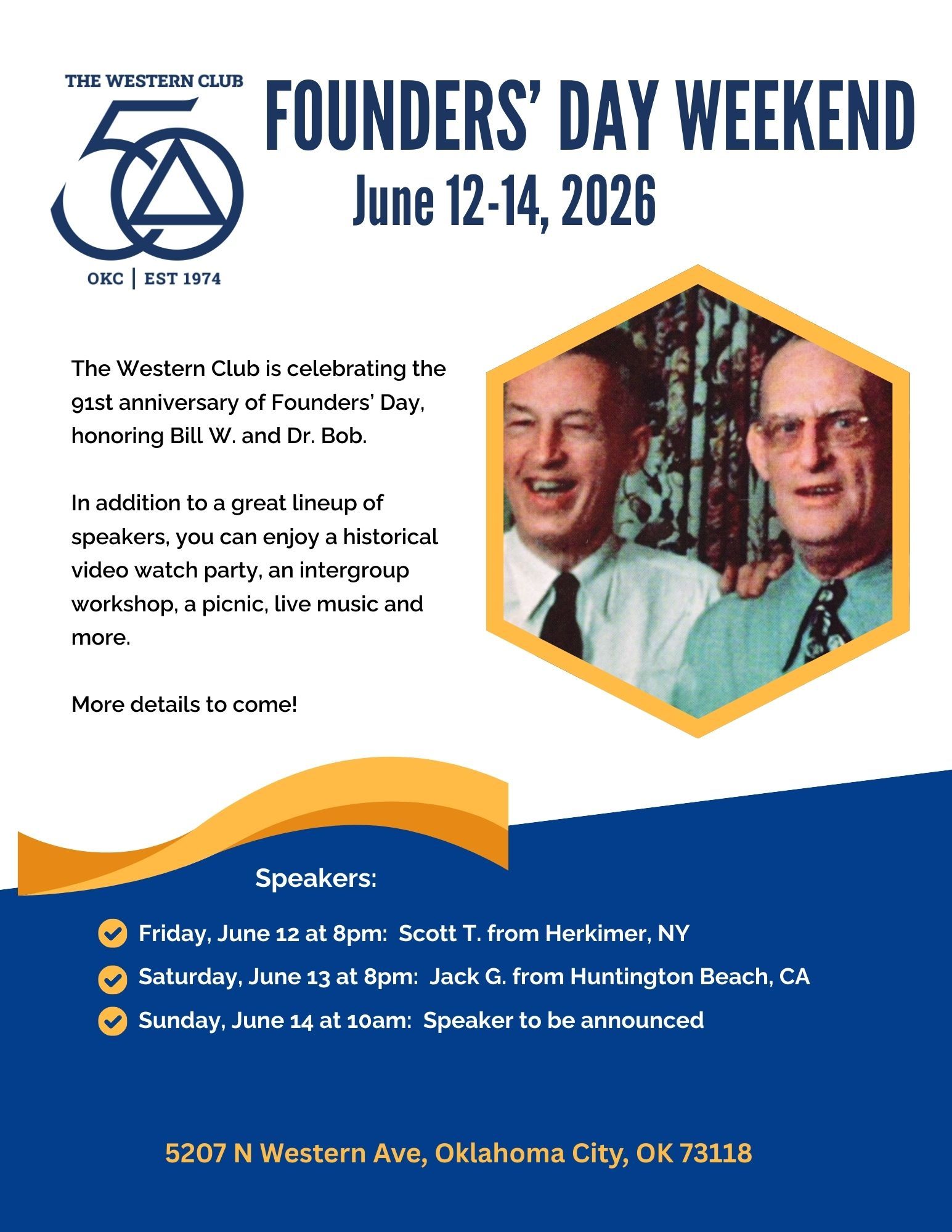 Founders' Day Weekend: June 12-14th we are celebrating Alcoholics Anonymous with speakers, events and a picnic. Come out and join us!