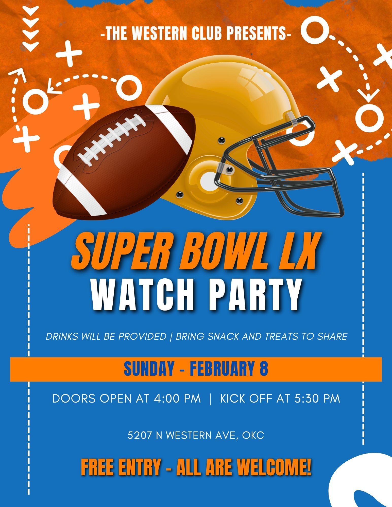 Super Bowl LX Watch Party: Sunday February 8th starting at 4:00 p.m and going till the game ends. The Western Club will be providing drinks and some snacks, bring more to share. Let's enjoy the game sober with friends!
